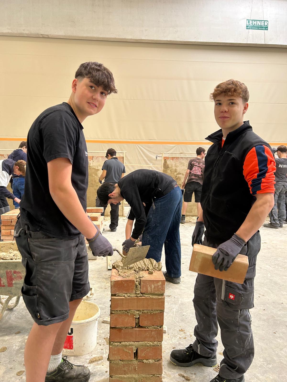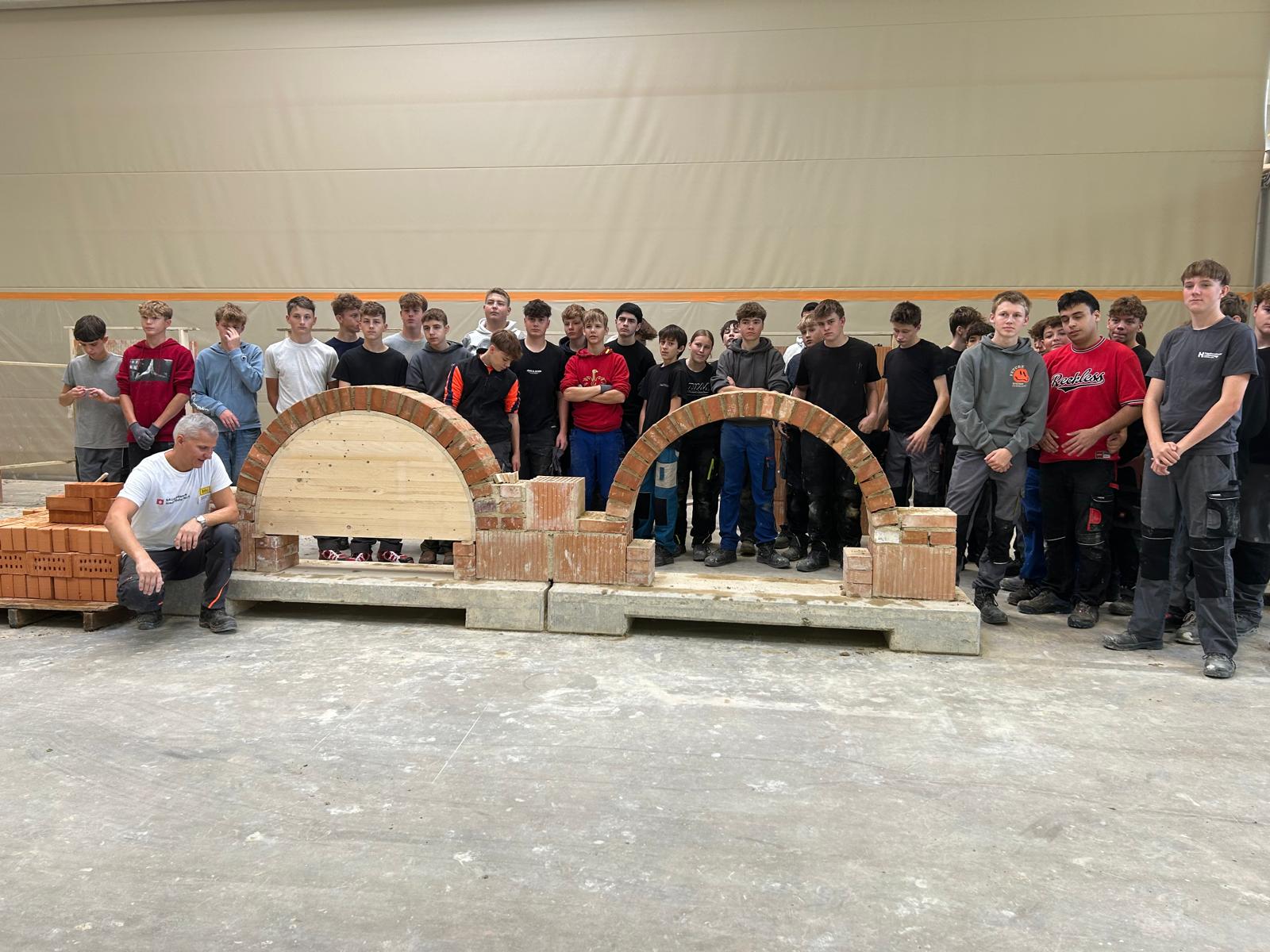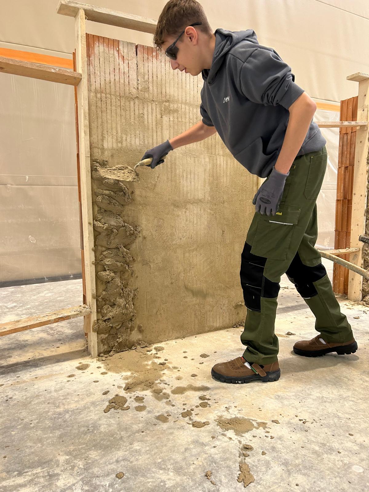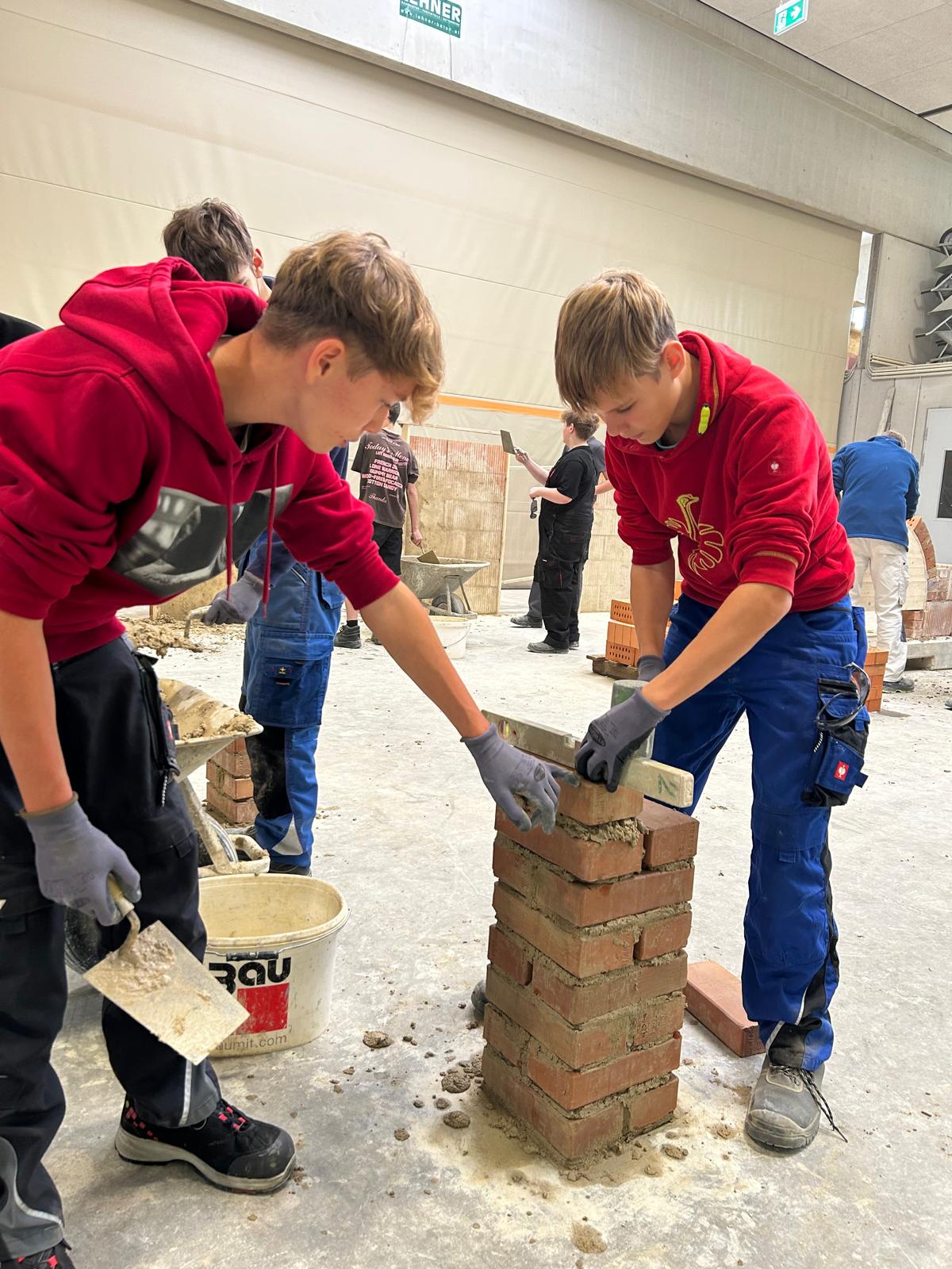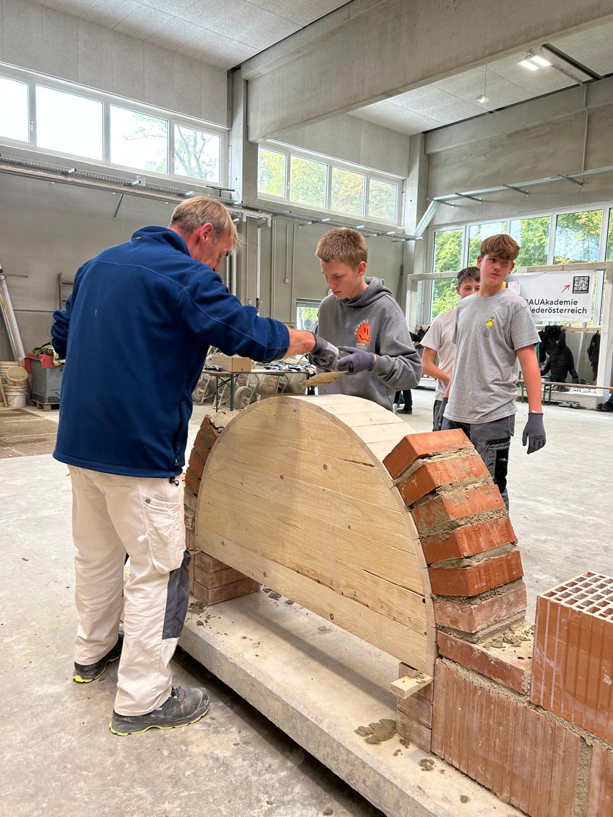 Früh morgens starteten wir mit einem von der Bauakademie organisierten Bus Richtung Langenlois. Nach einer kurzen Einführung zu den Berufen im Bauwesen ging es direkt in die Praxis: In der großen Halle durften unsere Schüler an sechs Stationen selbst tätig werden – vom Verputzen über das Mauern eines Bogens bis hin zum Errichten einer Verschalung.