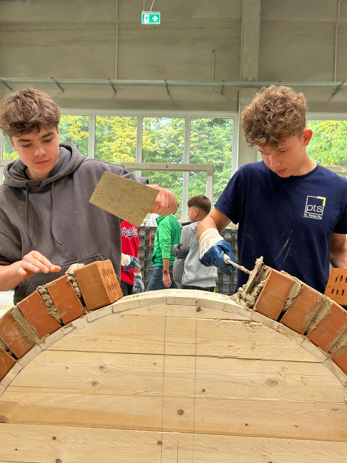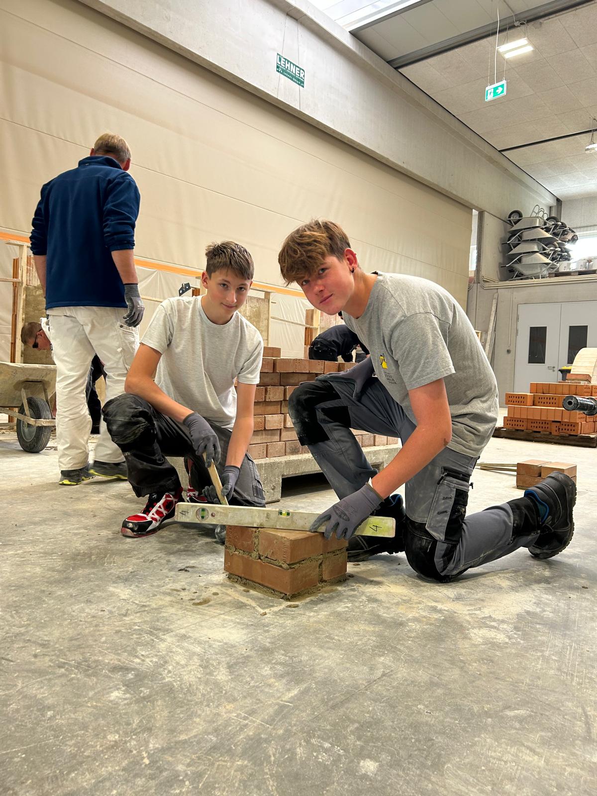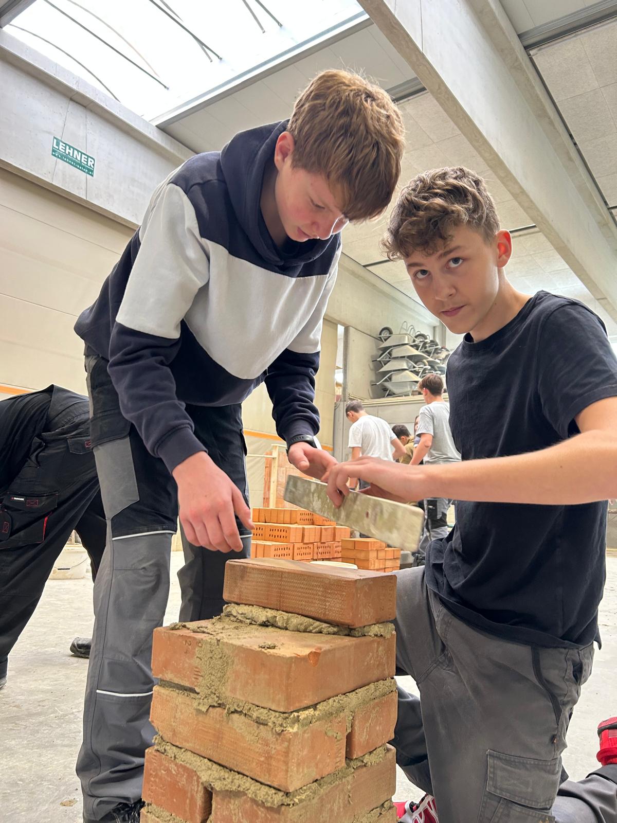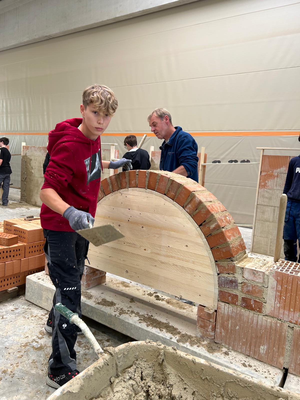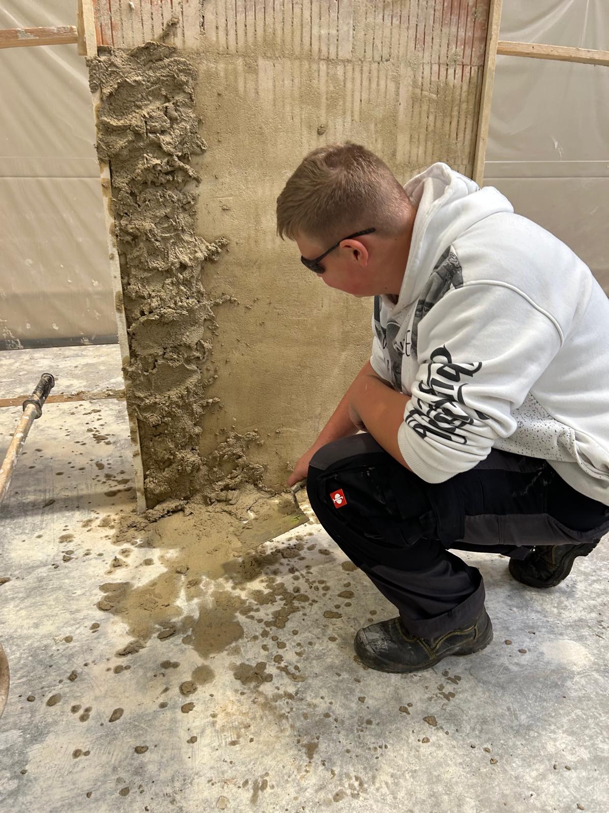 Früh morgens starteten wir mit einem von der Bauakademie organisierten Bus Richtung Langenlois. Nach einer kurzen Einführung zu den Berufen im Bauwesen ging es direkt in die Praxis: In der großen Halle durften unsere Schüler an sechs Stationen selbst tätig werden – vom Verputzen über das Mauern eines Bogens bis hin zum Errichten einer Verschalung.