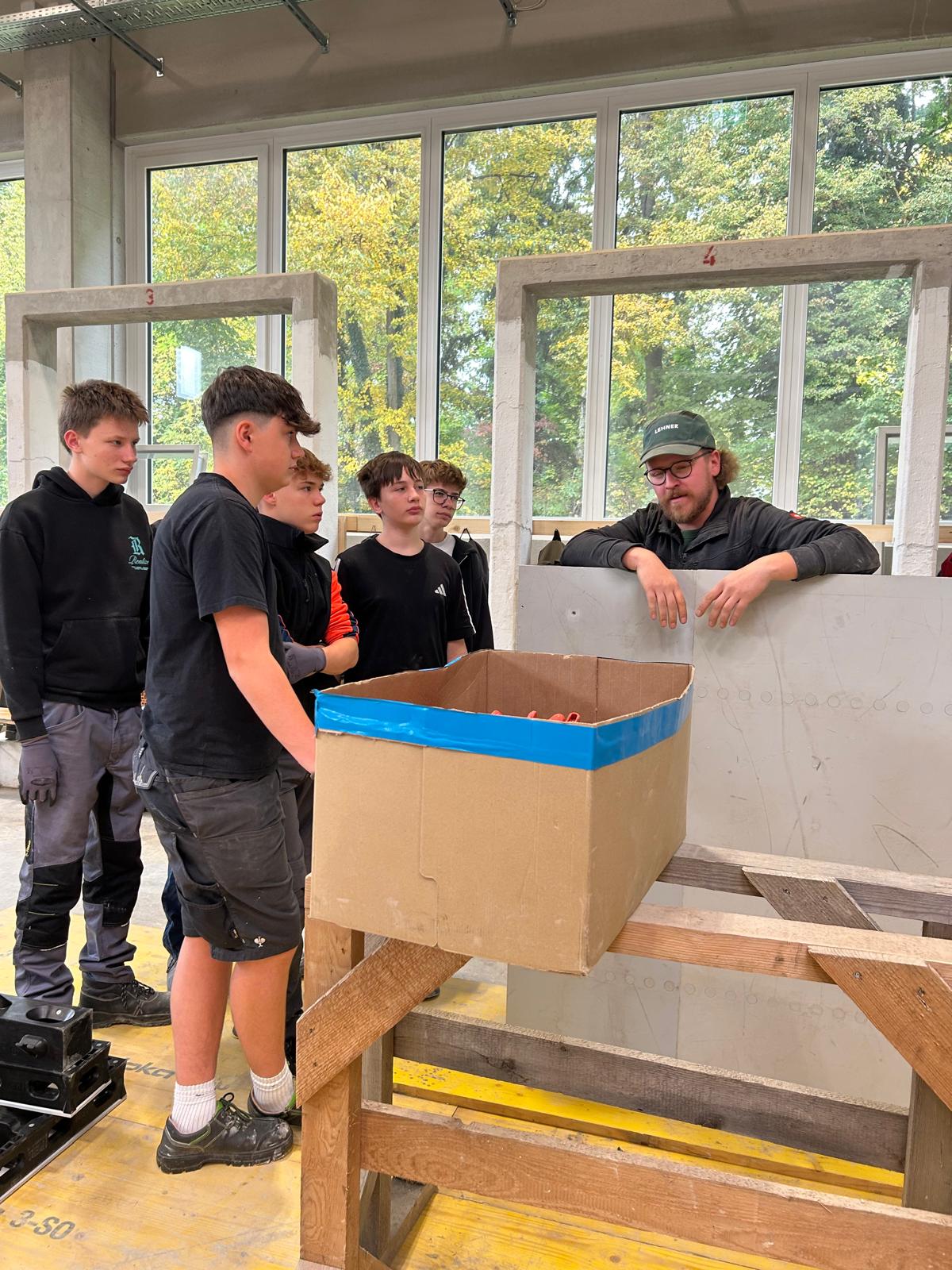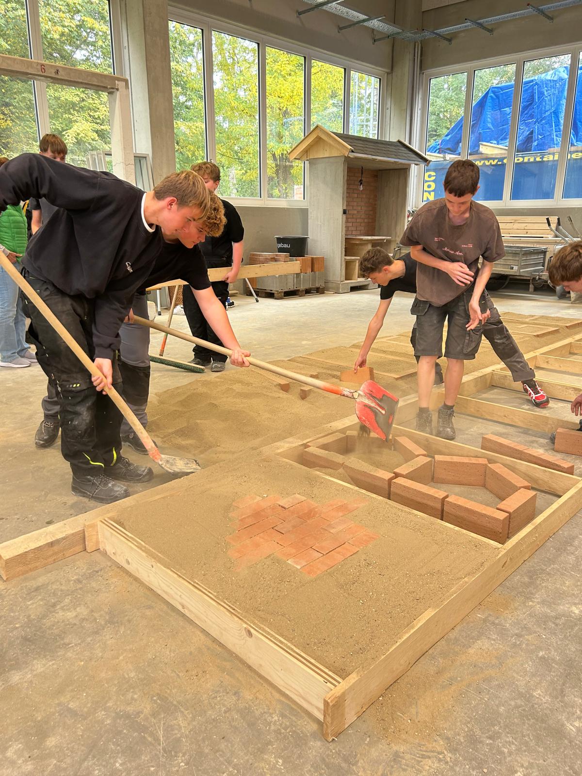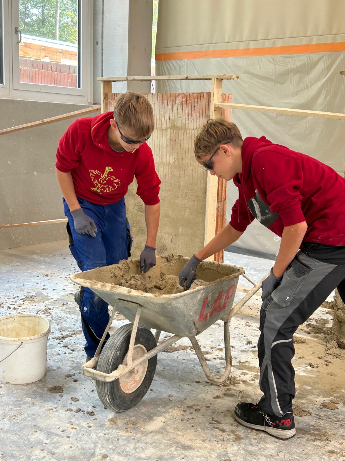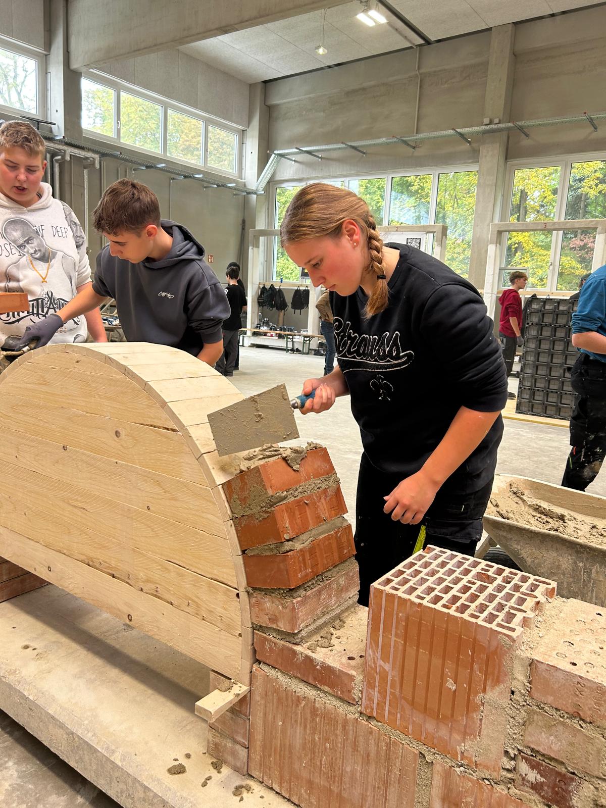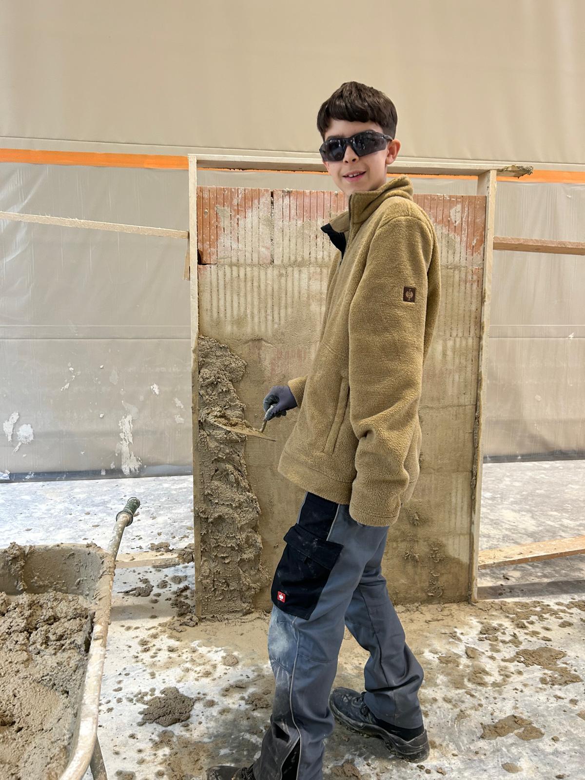 Früh morgens starteten wir mit einem von der Bauakademie organisierten Bus Richtung Langenlois. Nach einer kurzen Einführung zu den Berufen im Bauwesen ging es direkt in die Praxis: In der großen Halle durften unsere Schüler an sechs Stationen selbst tätig werden – vom Verputzen über das Mauern eines Bogens bis hin zum Errichten einer Verschalung.