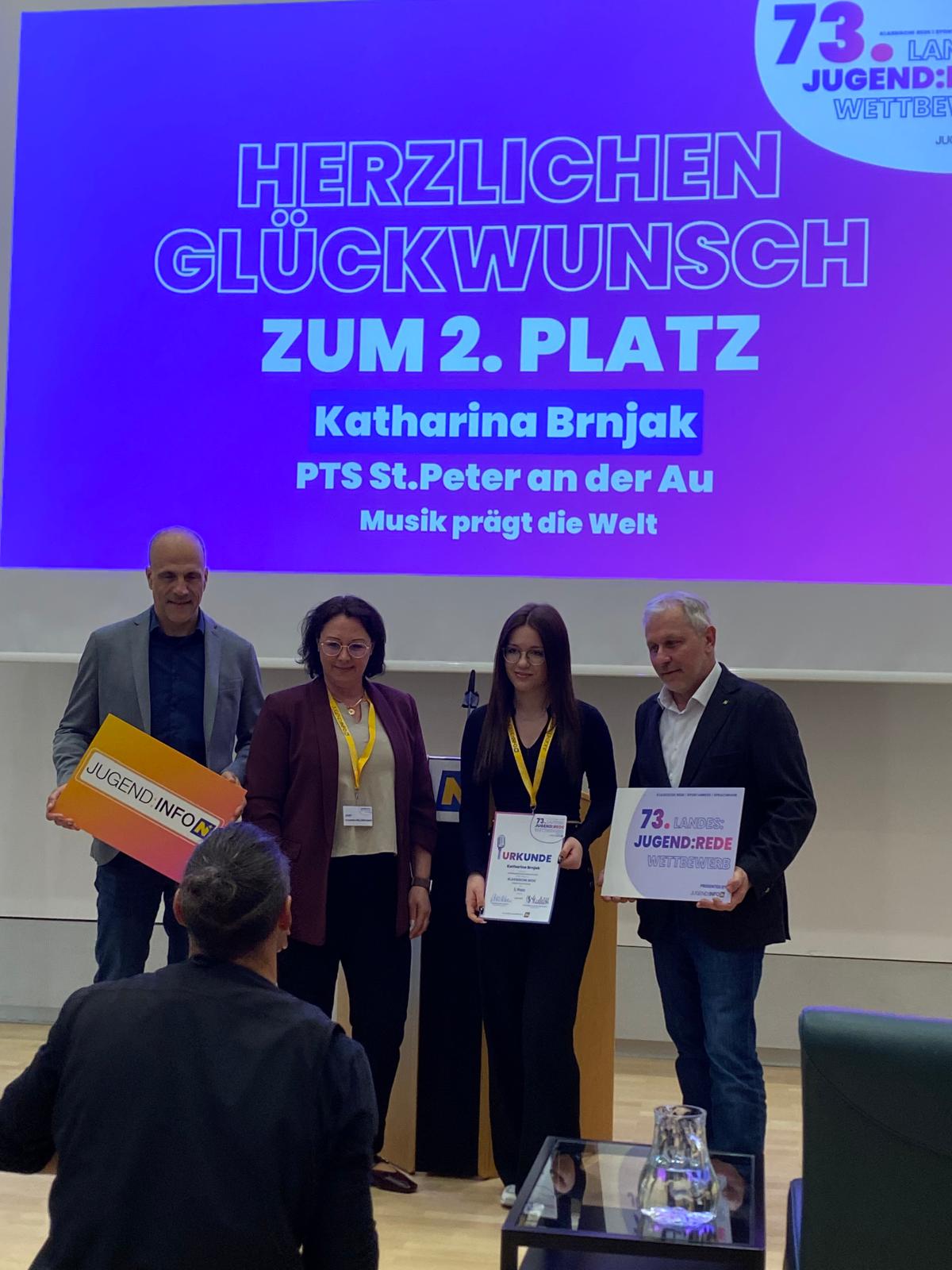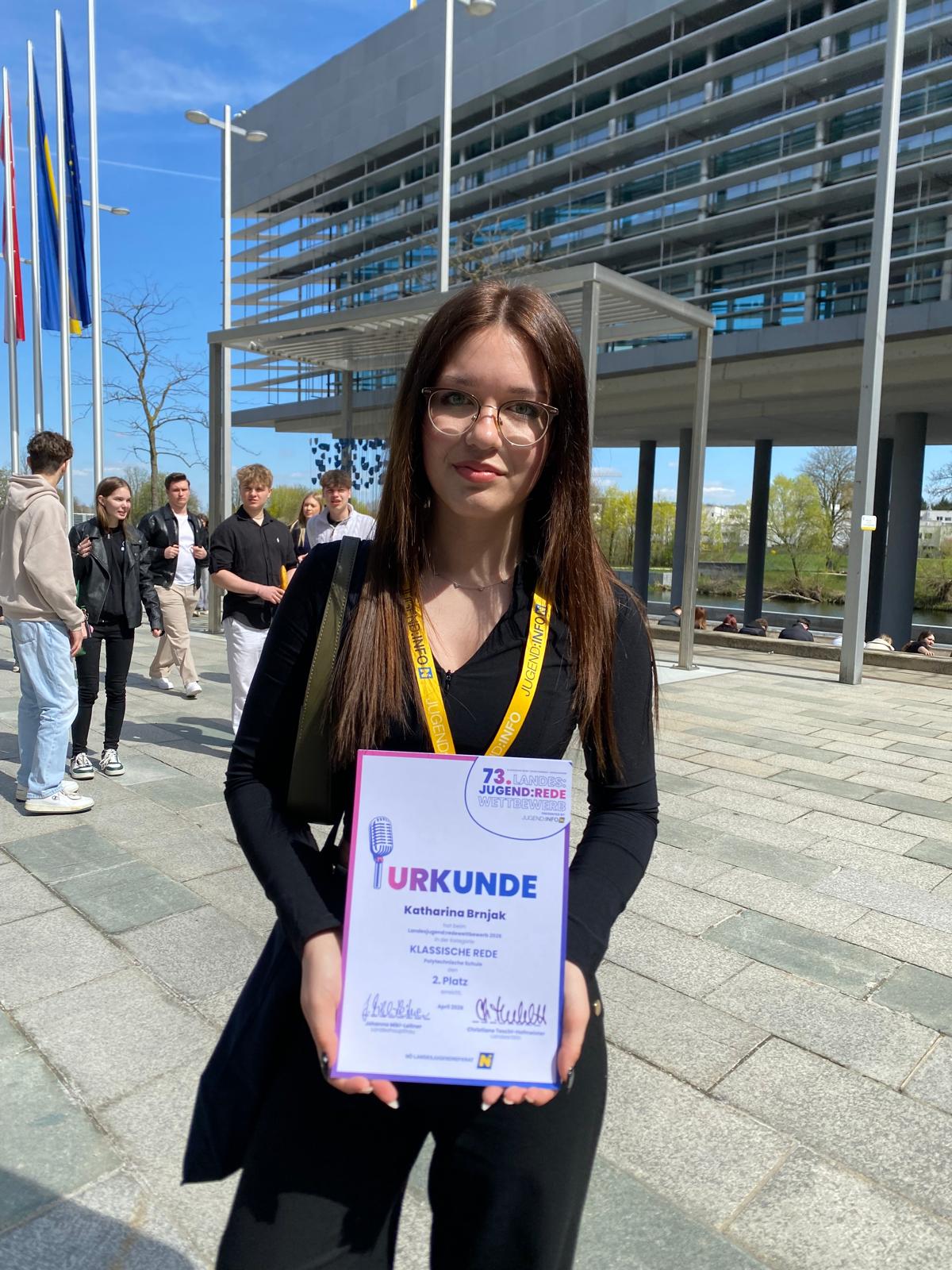Großer Erfolg für unsere Schule: Bei der diesjährigen Austragung des NÖ Jugendredewettbewerbs im Landhaus St. Pölten konnte Katharina Brnjak die Jury auf ganzer Linie überzeugen. Mit ihrer beeindruckenden Rede zum Thema „Musik prägt die Welt“ sicherte sie sich den hervorragenden 2. Platz in der Kategorie der Polytechnischen Schulen.